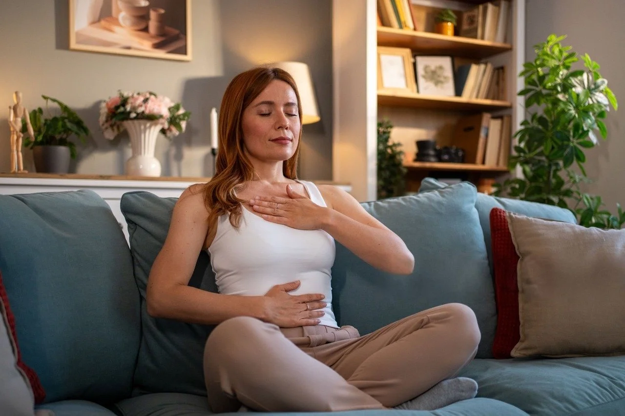 Place one hand on the chest and one on the abdomen. Inhale deeply through the nose, allowing the belly to rise, then exhale slowly through the mouth. Practice 3–5 minutes daily to relieve stress and increase oxygen flow.